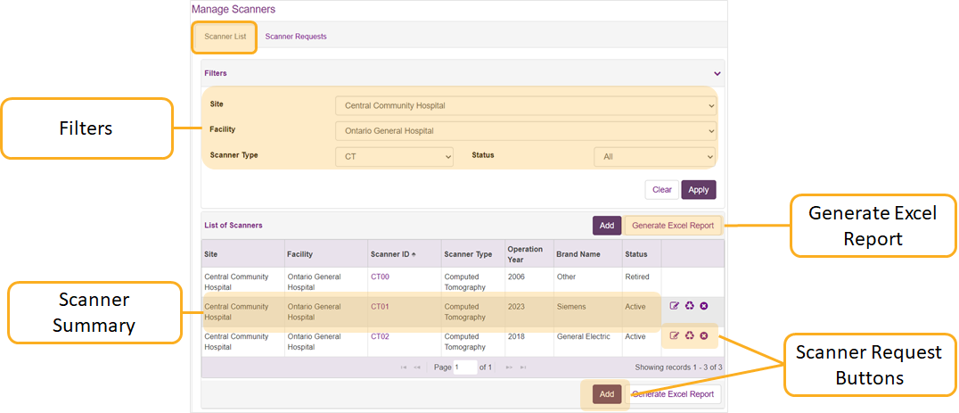 Use the Scanner Request Buttons to initiate a scanner request to add, edit, replace or retire a scanner.