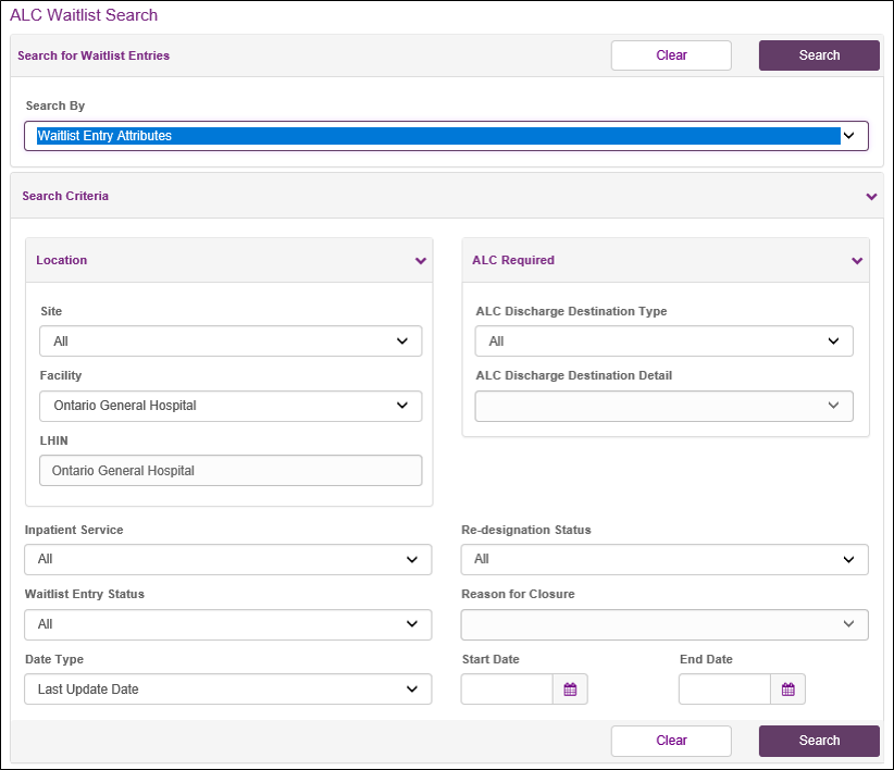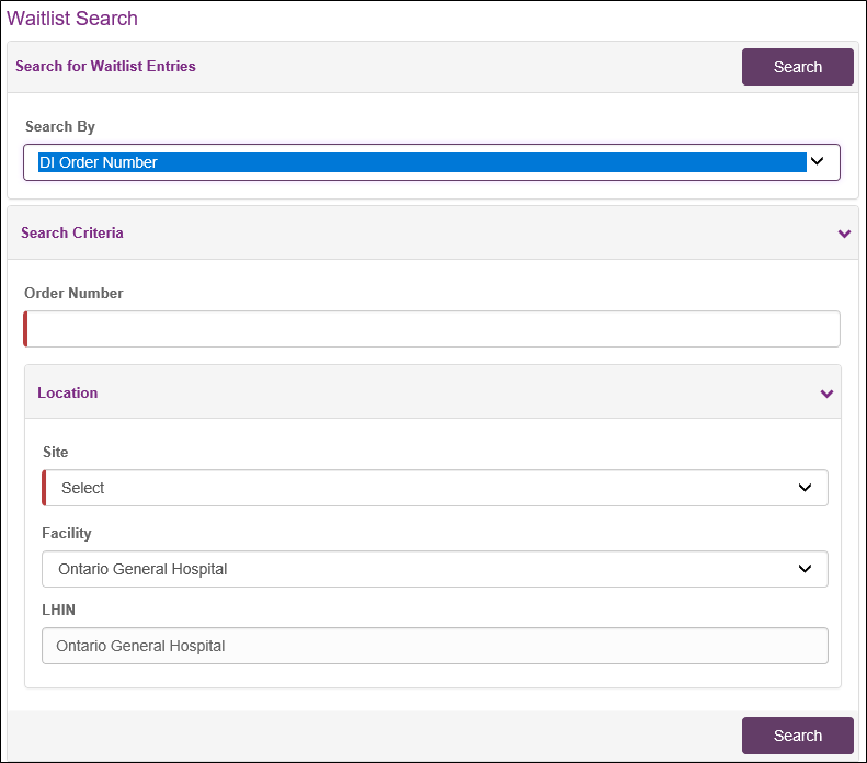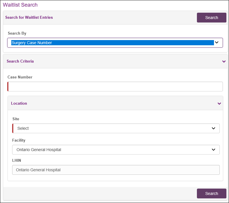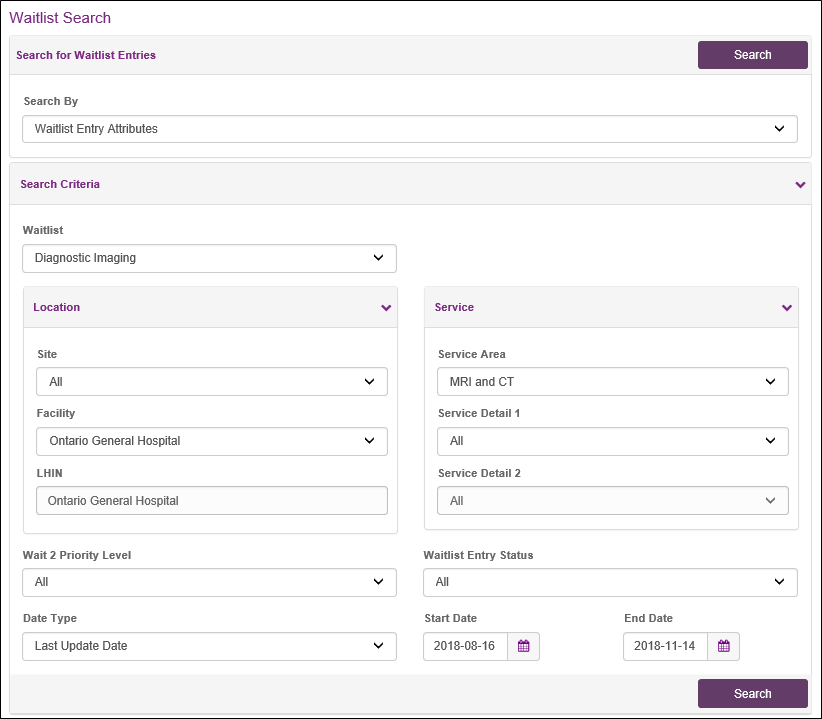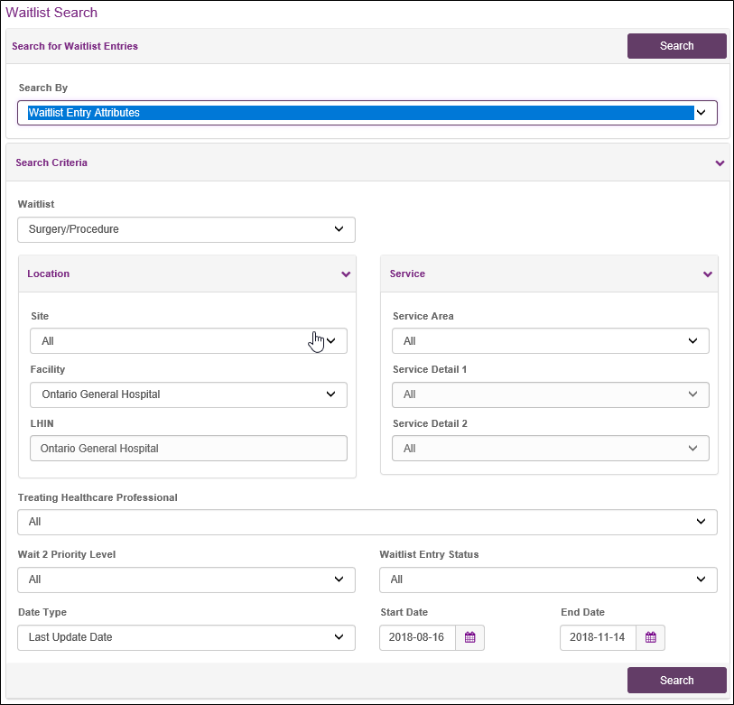 | Note: The search is limited to a 90 day period for Surgery and DI. The end date defaults to today's date, the start date defaults to 90 days prior. |